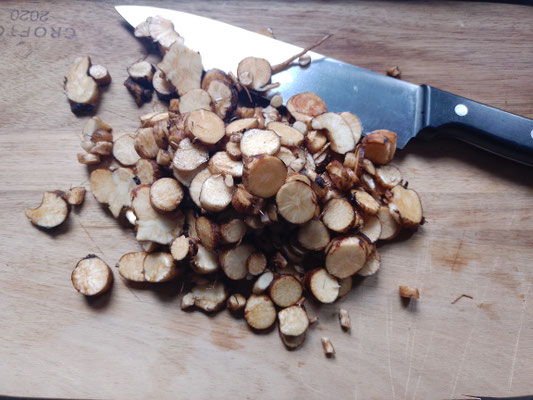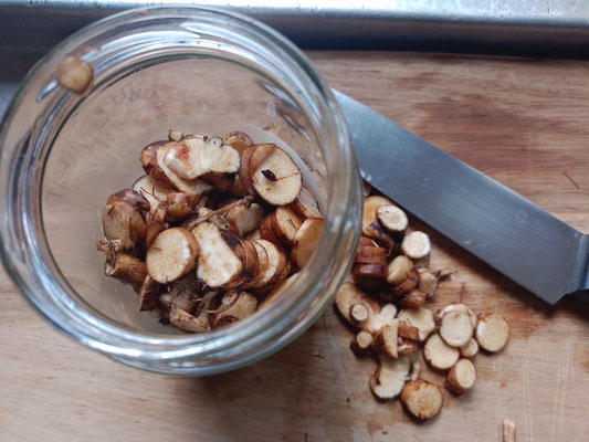 Wir stellen aus einer Pflanze eine Tinktur her, die bei Erkältungskrankheiten eingesetzt werden kann, aus einer weiteren ein Öl, das auch in die tiefere Muskulatur eindringt und zum guten Schluss einen Heilwein.
